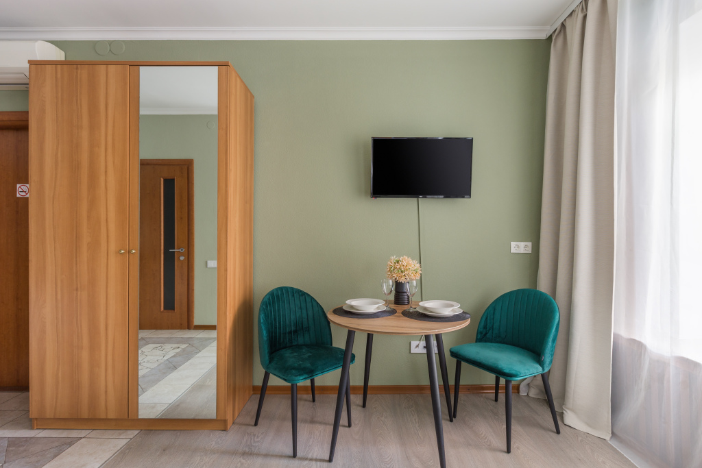 In the room, for you, there is a TV. The room equipment depends on its category.