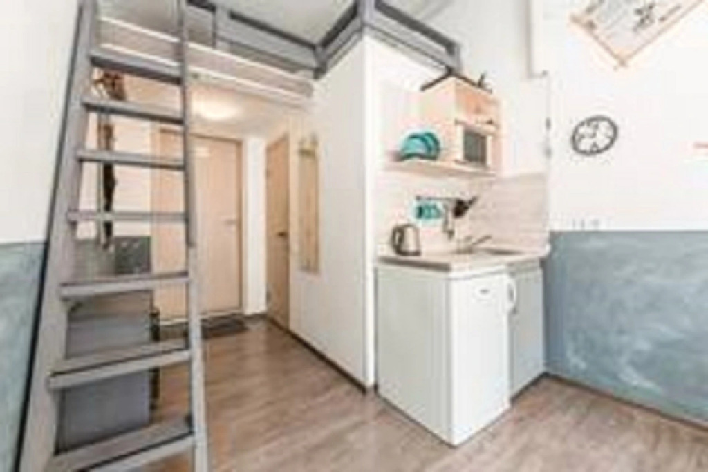 The studio has 2 levels and is designed in a loft style with handmade elements. On the first level there is a combined bathroom with a shower, a kitchen area, a refrigerator, a TV, a chest of drawers and clothes hangers, a folding sofa bed for two. Studio 7 does not have a sofa bed. On the second level there is a sleeping area with a double orthopedic mattress 160x200 cm.