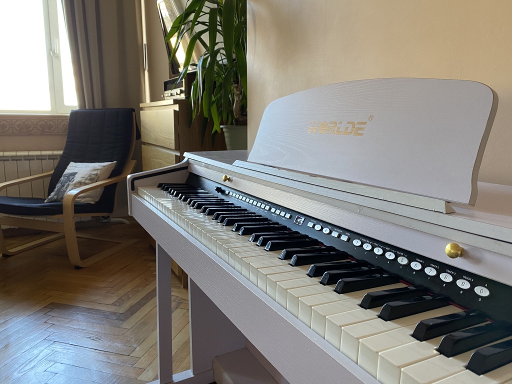 There are dishes and kitchen utensils for cooking, a play and book area for children, and an electronic piano for entertainment and creativity.