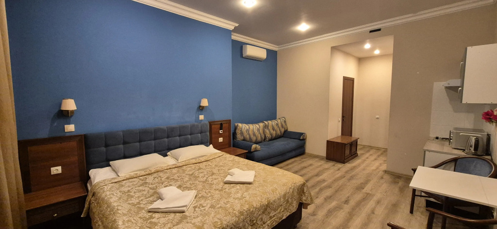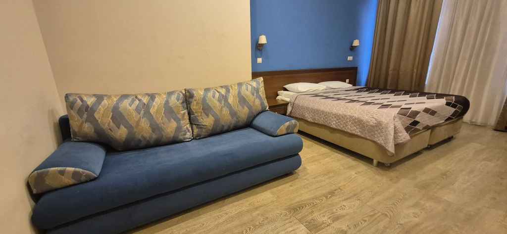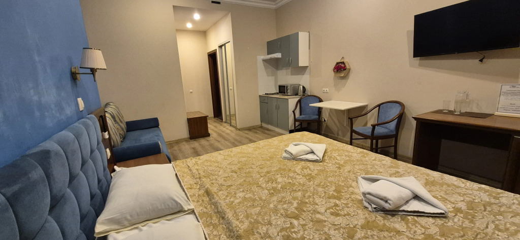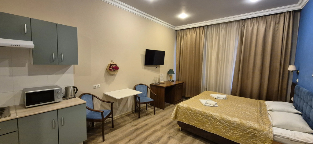 In the rooms for the comfort of guests: sleeping places, storage space, TV, desk, shower room with bathroom.