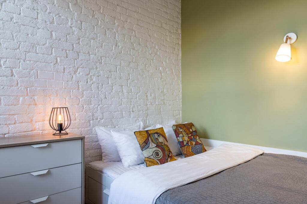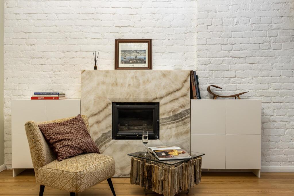 The apartment is equipped with everything necessary for living. The layout of this two-room apartment with two bedrooms and two separate bathrooms is suitable for groups of up to 5 people. The eclectic design combines a variety of interior items: designer renovation, a fireplace made of natural onyx, a wooden panel with Bali island, there is an engineered board on the floor, there are household appliances. Both bedrooms have double beds.