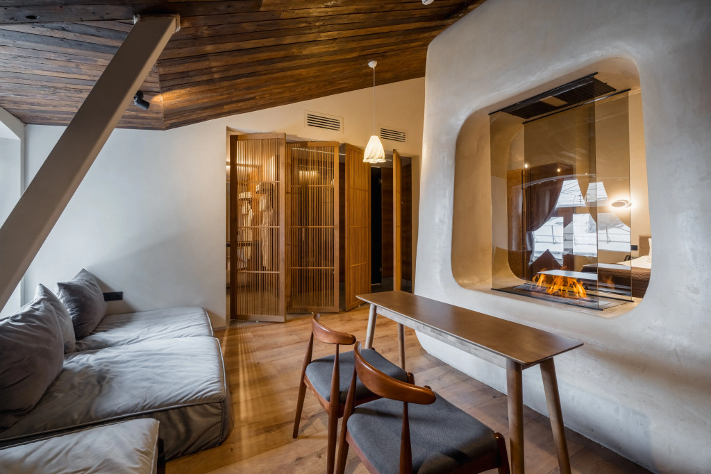 The lobby of the hotel is integrated into the arch. There is not only a reception, but also a Lobby gastrobar, the center of which is a hanging fireplace. Lobby's gastrobar offers guests classic dishes, wines, and signature cocktails.