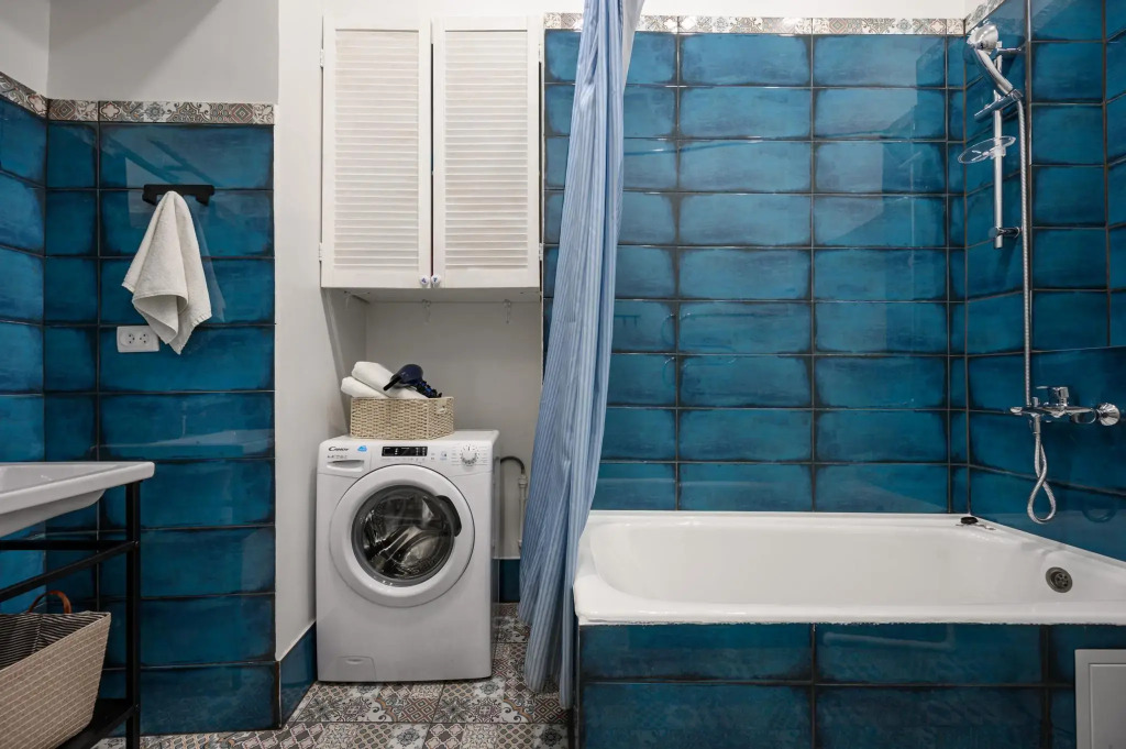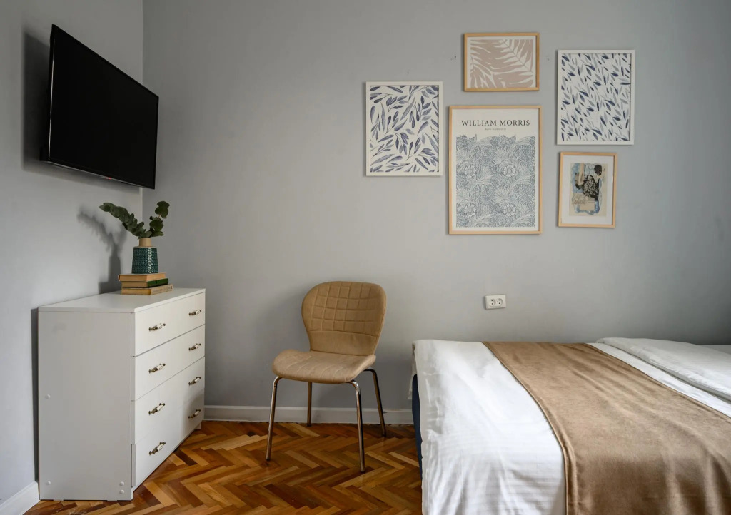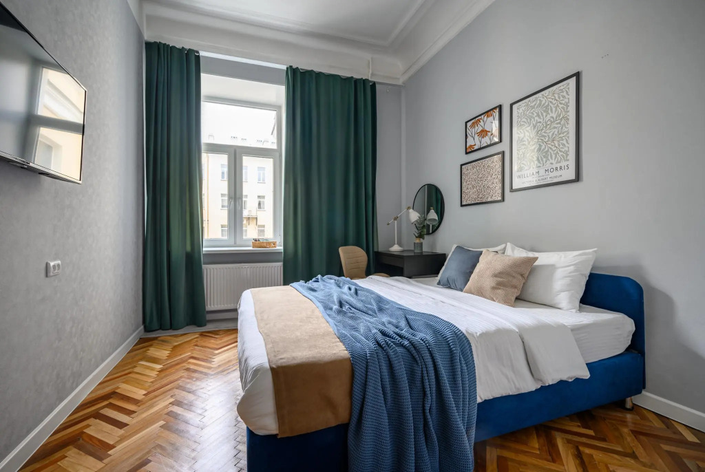 There are two bedrooms and a kitchen available for guests. The first bedroom is equipped with a double bed 160 cm wide, the second bedroom has two beds (140 cm and 90 cm). In addition, there is an additional 140 cm wide pull-out sofa in the entrance room. The kitchen with a dining table allows the guests to prepare meals in the apartment. The apartment is equipped with a washing machine, a dishwasher, an oven, a stove, a microwave, a refrigerator and a kettle.