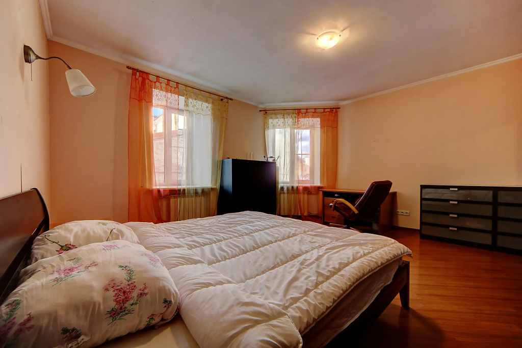 Specially for tourists who travel by car, there’s a parking zone. The apartment has 2 bedrooms. The area of the rooms is 24 sq.m. and 10 sq.m.
